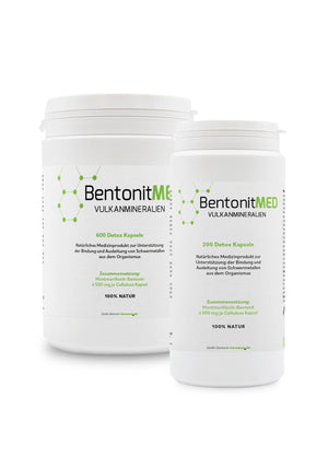 BentonitMED ist ein natürliches Produkt mit CE-Zertifizierung in Apothekenqualität aus dem Tonmineral Montmorillonit-Bentonit, das an seiner Oberfläche und den Schichtzwischenräumen verschiedene Schadstoffe binden kann und deshalb zur Detoxikation (Entgiftung) geeignet ist. Es ist unverdaulich, wasserunlöslich sowie quellfähig und bildet bei oraler Verabreichung im Unterschied zum ZeolithMED einen dünnen Montmorillonit-Gelschutzfilm. BentonitMED eignet sich damit vor allem zur Entgiftung bei empfindsamer Schleimhaut des Verdauungskanals.